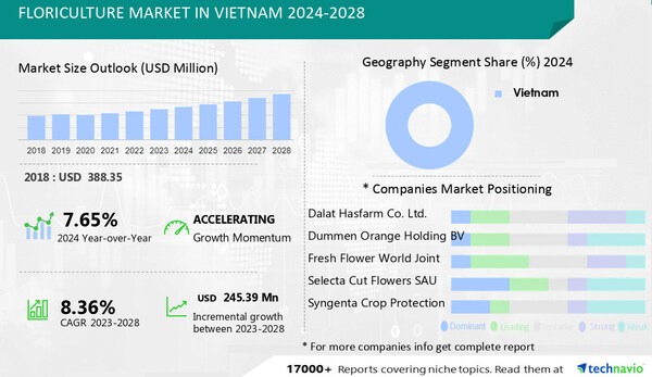 NEW YORK, March 27, 2024 /PRNewswire/ — The global Floriculture Market in Vietnam size is estimated to grow by USD 245.39 mn from 2024-2028, according to Technavio. The market is estimated to grow at a CAGR of 8.36% during the forecast period. In Vietnam, floriculture holds cultural significance for various occasions, including weddings and funerals. Commonly used flowers include roses, tulips, lilies, and jasmine. Sustainable practices, biotechnology, and modern technology are employed in cultivation. Exporters like Anthura and foreign firms utilize free-trade agreements and air cargo freight to supply fresh cut flowers to global markets, including the European Union. Prices and cultivation measures are influenced by agro-climatic conditions and imports from regions like Lam Dong province and river deltas. Monsanto and other investors contribute to the industry’s growth through advanced technology and practices. Key players include Seaways, Comtrade data, and the Australian Embassy.
